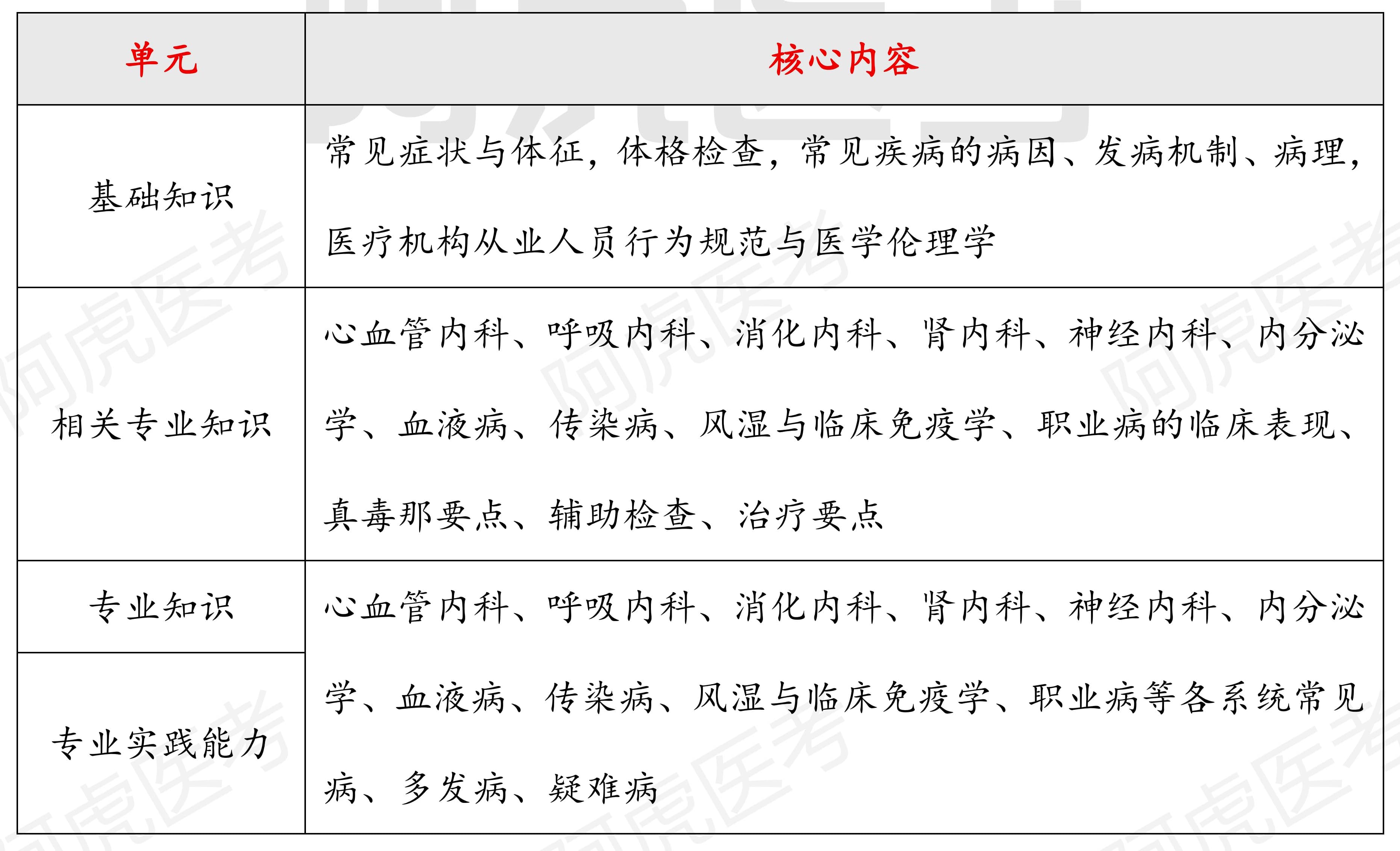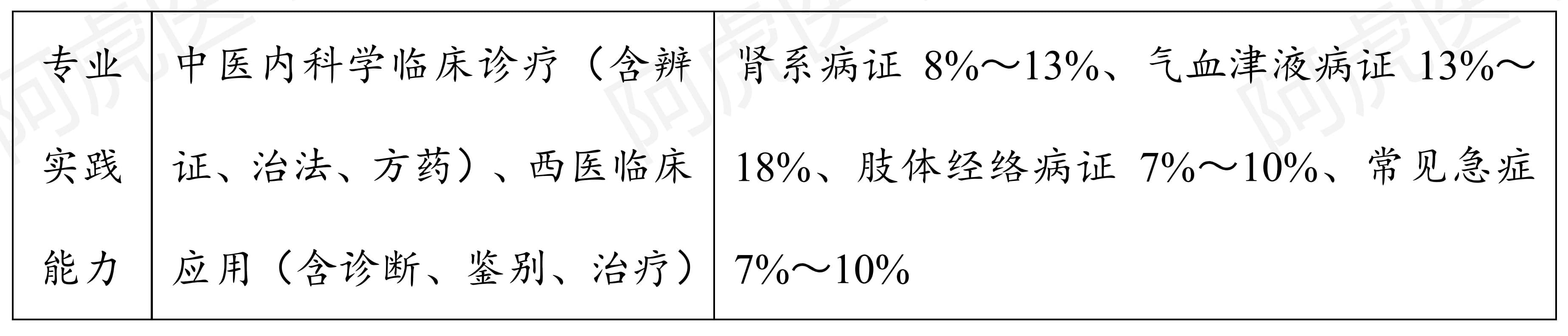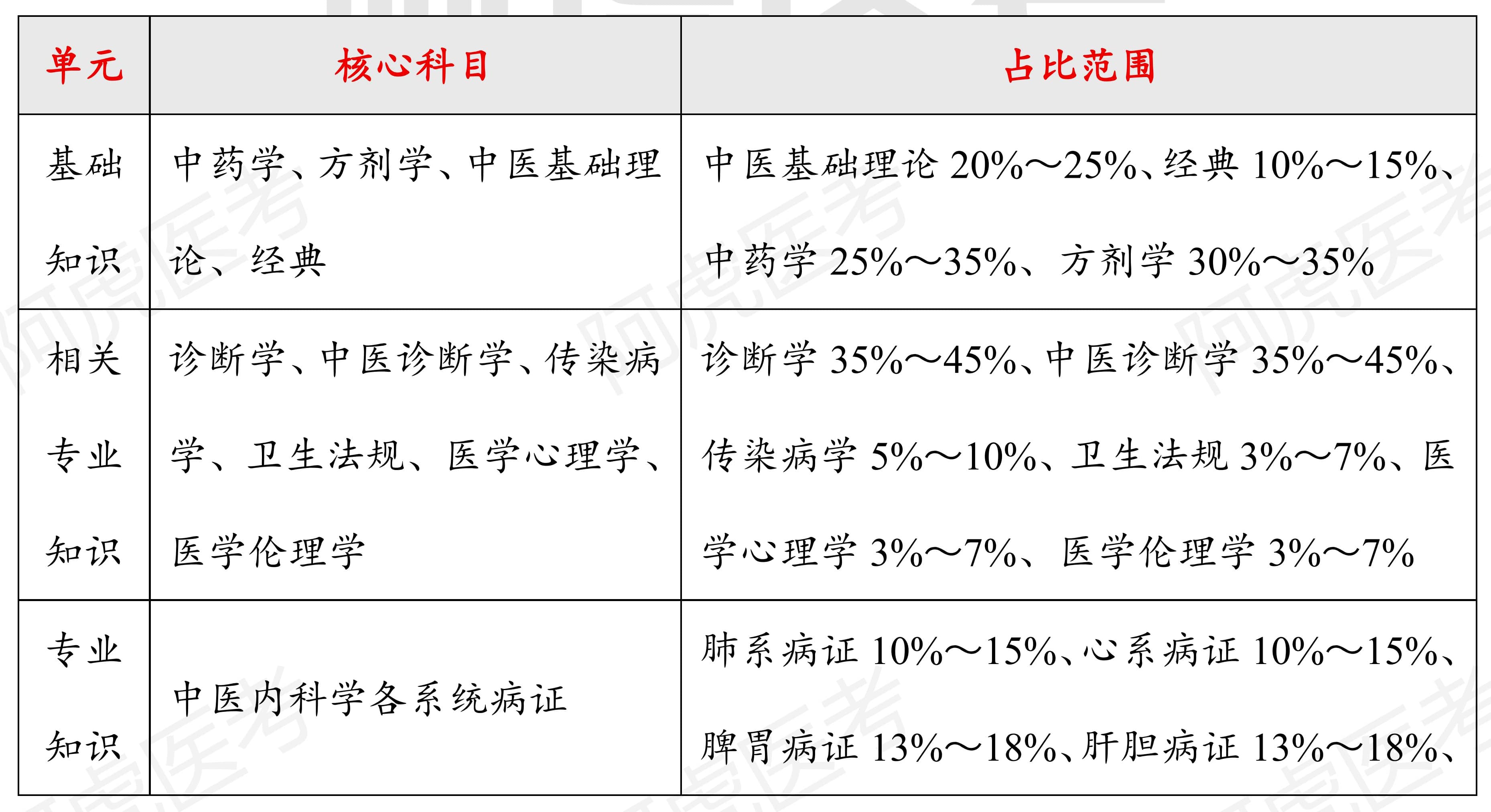中医内科学(315)侧重诊断学(常见症状、体格检查,少数实验室/影像学检查)、中医诊断学(四诊、八纲辨证、脏腑辨证),传染病学、卫生法规等考查较少。
