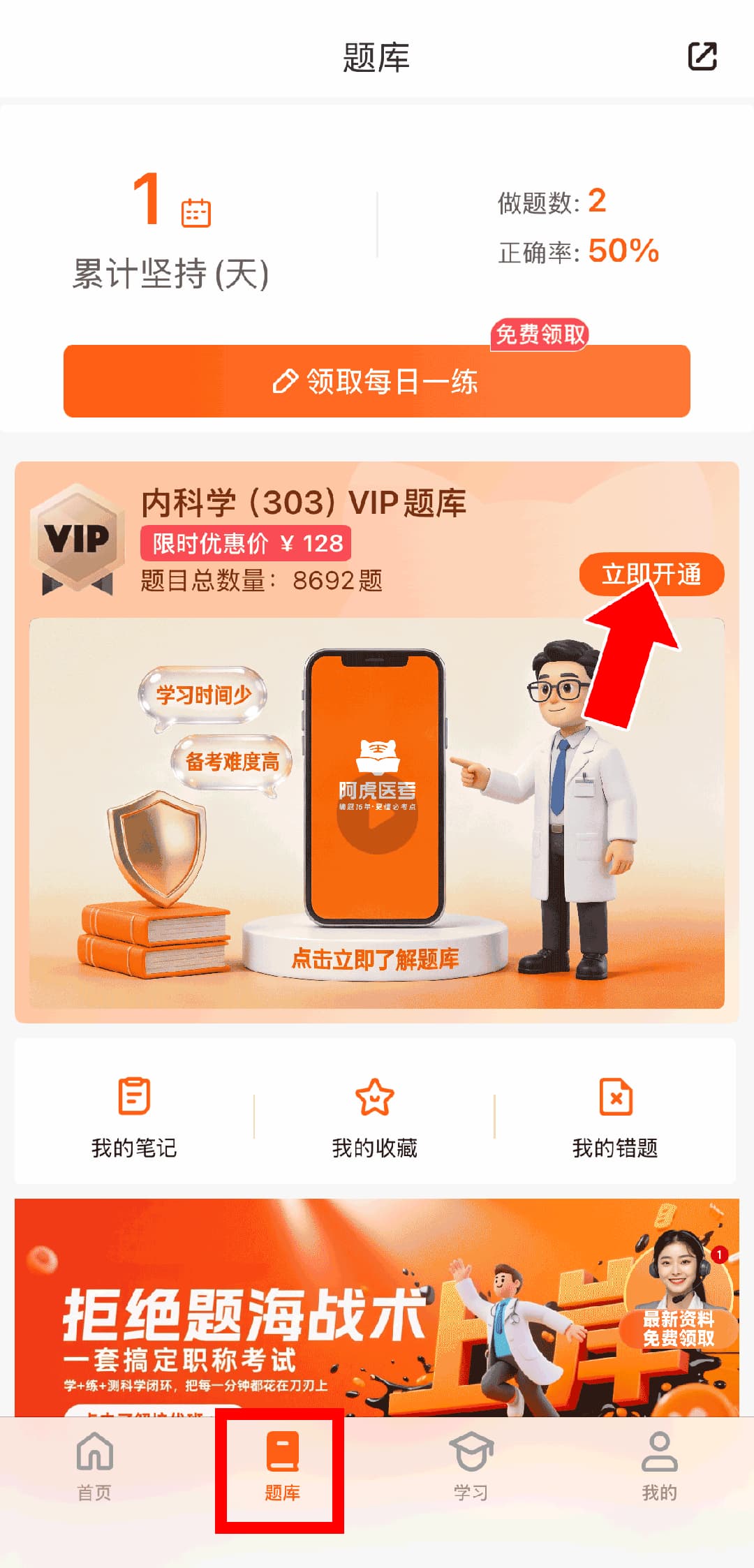 新题已经更新至对应科目VIP题库,大家联系备考老师购买VIP题库后,下载阿虎医考APP,选择对应科目,在“题库”页面,选择“VIP题库”即可开始做题。