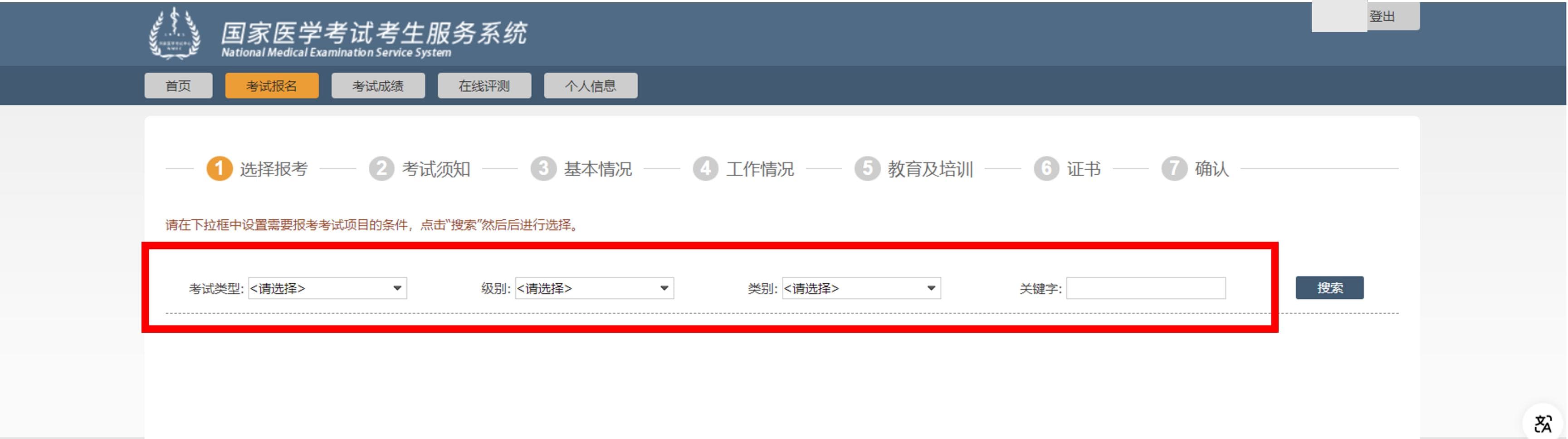 开始报名后,首先需要选择报考考试科目(医考考试即为考试类别/级别)。由于考试科目繁多,用户可通过设置页面顶部的筛选条件进行检索。