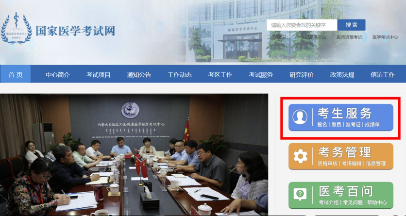 登录国家医学考试网(http://www.nmec.org.cn/),点击“考生服务”。