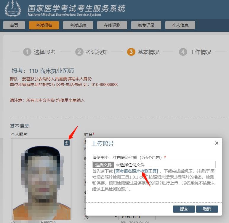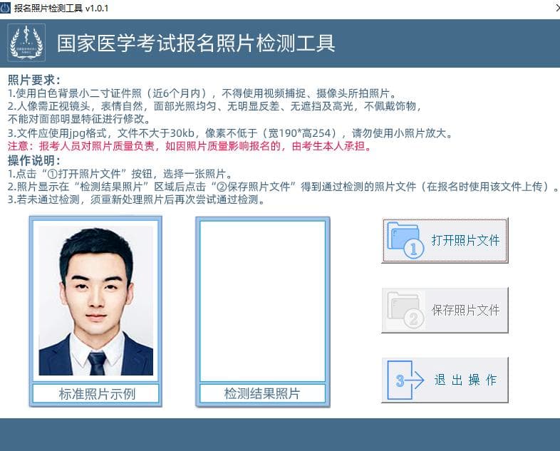 报名上传照片前须通过“医考报名照片检测工具”(下载地址在上传照片界面处提示,如下图)进行检测处理。检测过程请严格按页面说明操作,检测通过后保存,登陆国家医学考试考生服务系统报名时上传,报名系统不接受未经该工具检测的照片。请广大考生提前准备,以免影响考试报名。