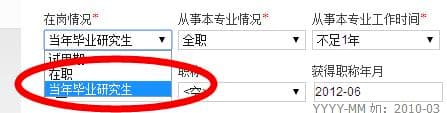 在岗情况一项中,以研究生学历报考的考生应注意,若本人为当年毕业研究生,尚未获取毕业证书,此处需要选择为“当年毕业研究生”。
