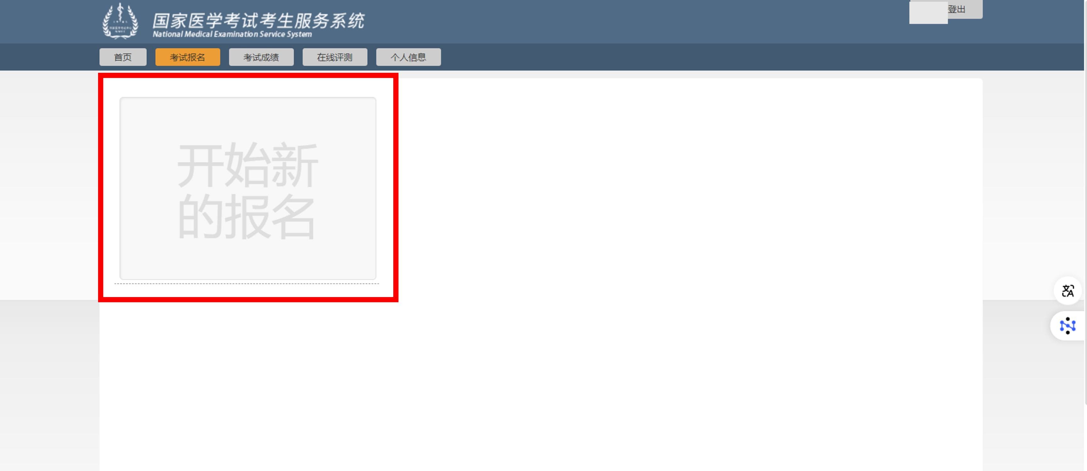 页面左首显示为“开始新的报名”,点击“开始新的报名”即可开始进行报名操作。同时在右侧会顺序列出在考试平台中曾经报考的考试项目及基本情况。