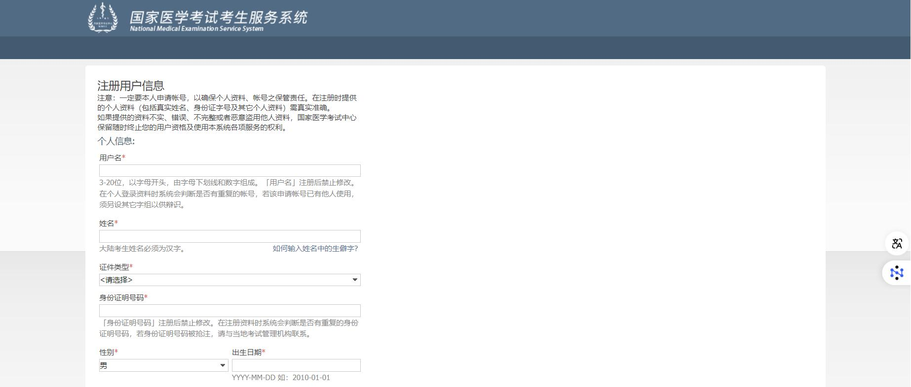 点击“注册”按钮进行网上注册。注册用户名可用于国家医学考试中心开放的所有考试报名,还用于打印准考证和查询成绩等考试服务。
